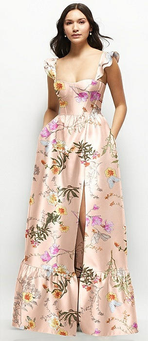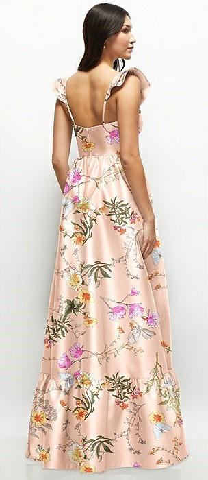 Floral Satin Corset Maxi Dress with Ruffle Straps & Skirt in butterfly botanica pink sand