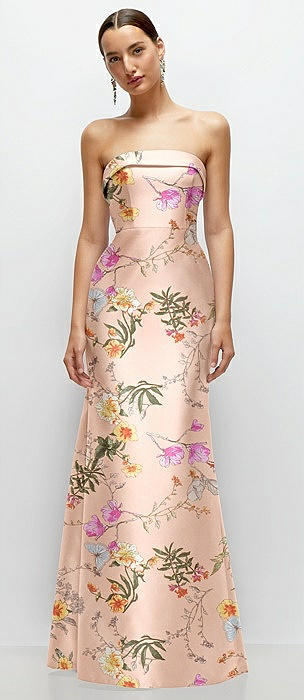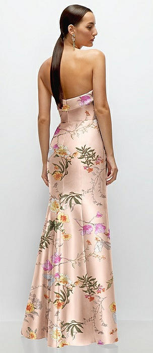 Strapless Cuff Neckline Floral Satin Trumpet Gown in butterfly botanica pink sand