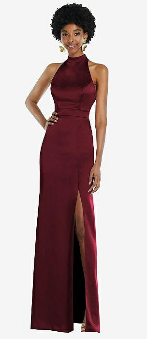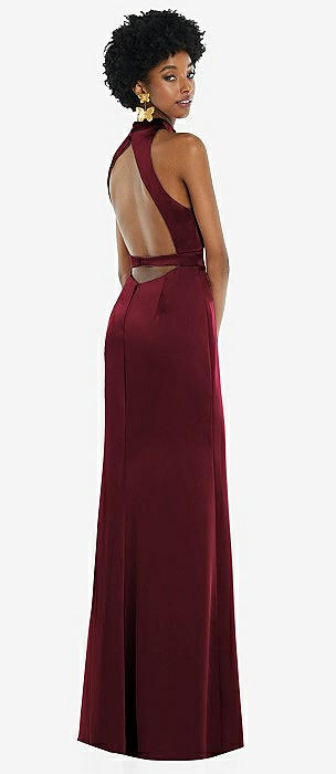 High Neck Backless Maxi Dress with Slim Belt in cabernet