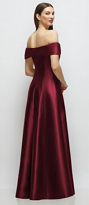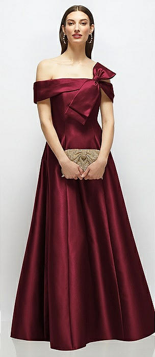 Asymmetrical Bow Off-Shoulder Satin Gown with Ballroom Skirt in cabernet