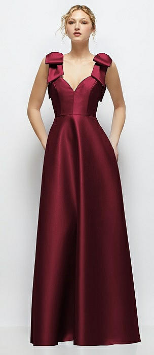 Deep V-Neck Satin Ball Gown with Shoulder Bows in cabernet