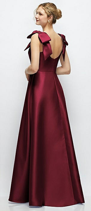 Basque-Neck Satin Column Maxi Dress with Off-the-Shoulder Bows in cabernet