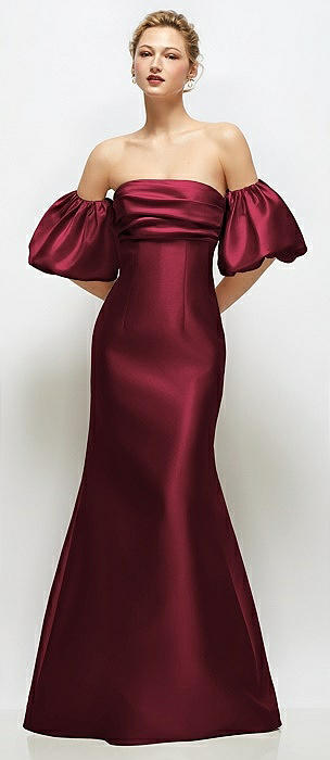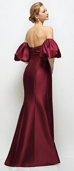 Off-the-Shoulder Puff Sleeve Satin Maxi Dress with Flared Skirt in cabernet