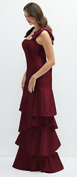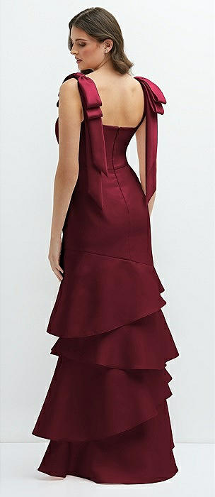 Bow-Shoulder Satin Maxi Dress with Asymmetrical Tiered Skirt in cabernet