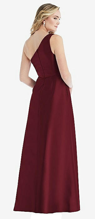 One-Shoulder Satin Gown with Draped Front Slit and Pockets in cabernet