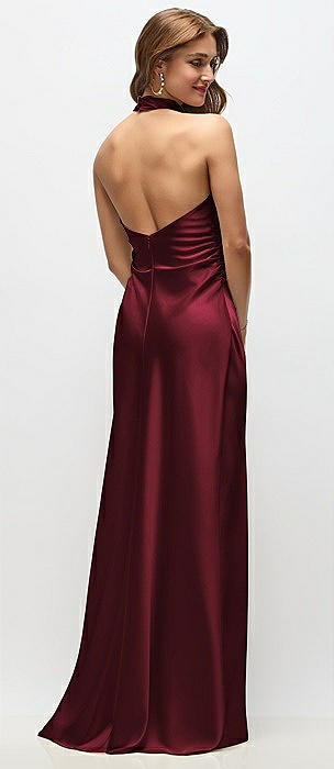 Pleated Halter Bias Satin Maxi Dress with Self-Tie Bow Back in cabernet