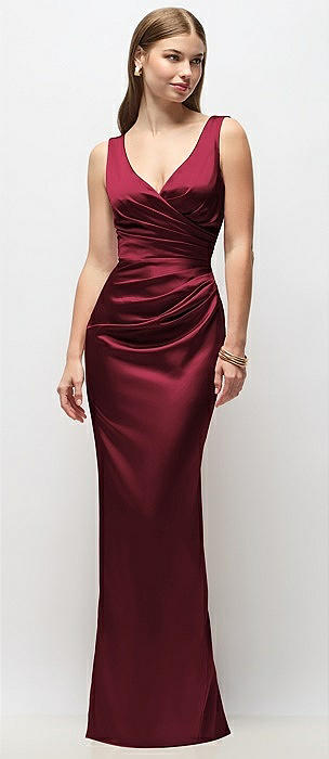 Sleeveless Draped Wrap Bodice Stretch Satin Column Maxi Dress in cabernet