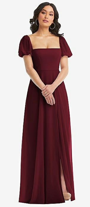 Plunge Neckline Bow Shoulder Empire Waist Chiffon Maxi Dress in cabernet