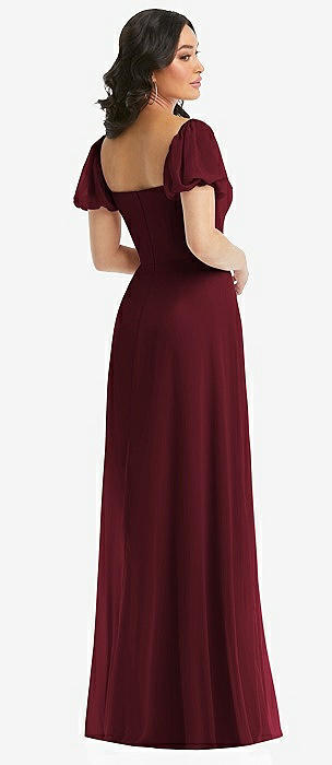 Shirred Shoulder Criss Cross Back Maxi Dress with Front Slit in cabernet