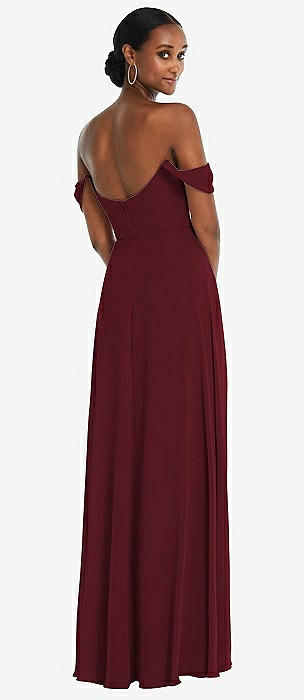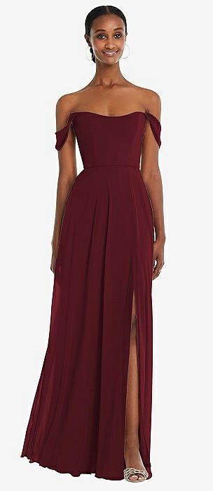 Off-the-Shoulder Basque Neck Maxi Dress with Flounce Sleeves in cabernet