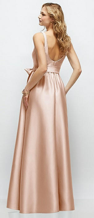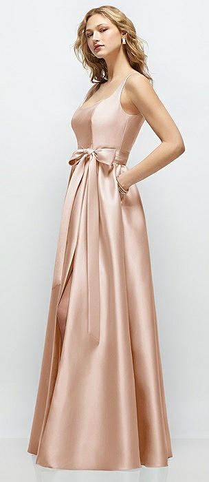 Scoop Neck Drop Basque Skirt Satin Maxi Dress with Pockets in cameo