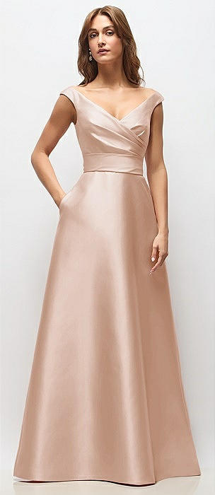 Off-the-Shoulder Draped Wrap Satin Maxi Dress in cameo