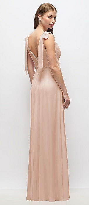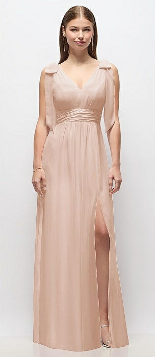 Plunge Neckline Bow Shoulder Empire Waist Chiffon Maxi Dress in cameo
