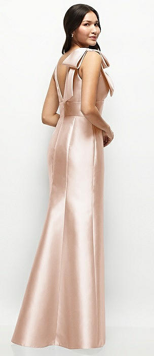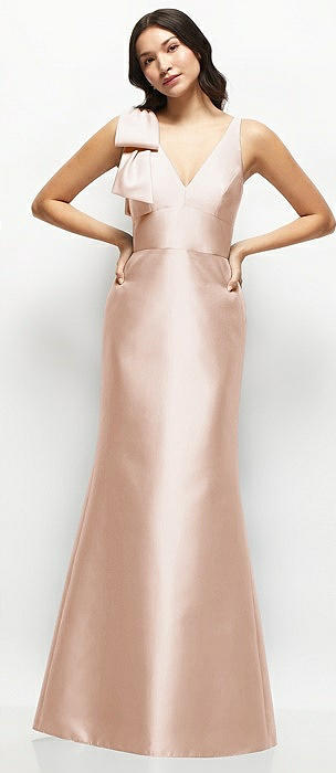 Deep V-back Satin Trumpet Dress with Cascading Bow at One Shoulder in cameo