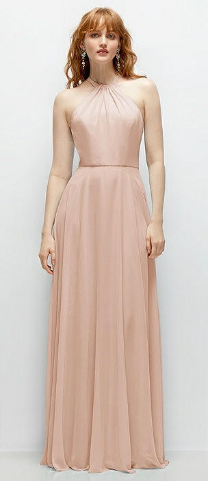 Shirred Halter Chiffon Maxi Dress with Back Sash-Tie Closure in cameo