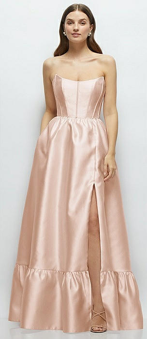 Lace-Up Back Bustier Satin Dress with Full Skirt and Pockets in cameo