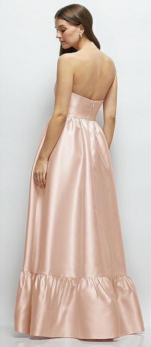 Strapless Satin Maxi Dress with Cascade Ruffle Peplum Detail in cameo