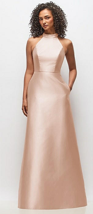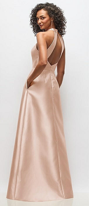 Jewel Neck Halter Full A-Line Satin Maxi Dress in cameo
