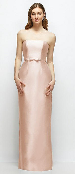 Strapless Satin Column Dress with Bow-Trimmed Skinny Belt in cameo