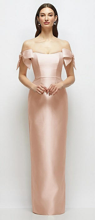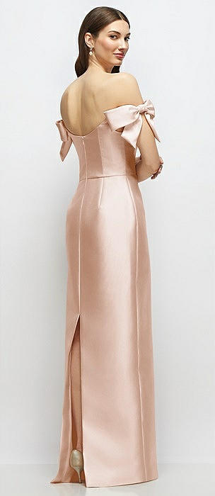Basque-Neck Satin Column Maxi Dress with Off-the-Shoulder Bows in cameo