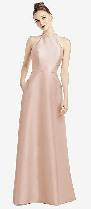 High-Neck Cutout Satin Dress with Pockets in cameo