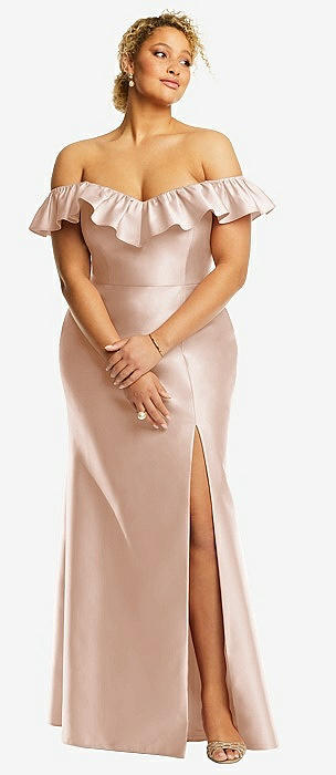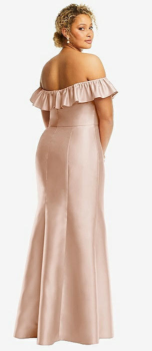 Off-the-Shoulder Ruffle Neck Satin Trumpet Gown in cameo