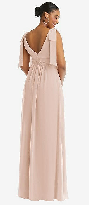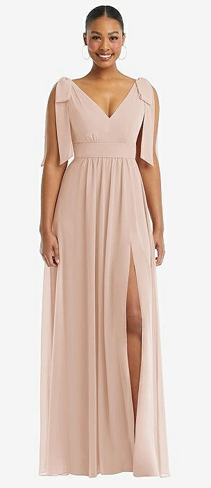 Plunge Neckline Bow Shoulder Empire Waist Chiffon Maxi Dress in cameo