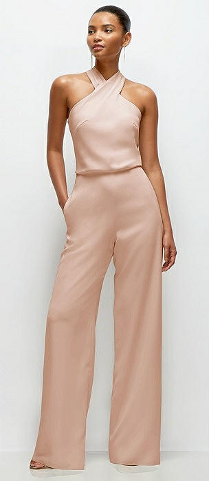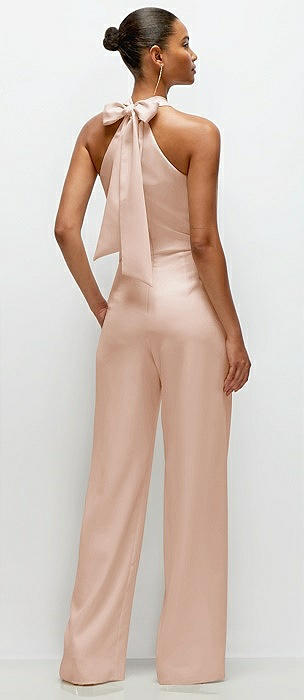 Pleated Halter Blouson Crepe Wedding Jumpsuit with Self-Tie Bow Back