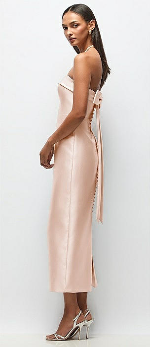 Strapless Cuff Satin Midi Dress with Column Skirt & Back Bow in cameo