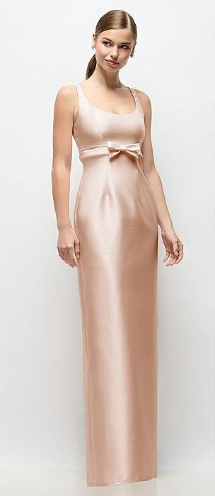 Scoop Neck Satin Column Maxi Dress with Bow at Empire Waist in cameo