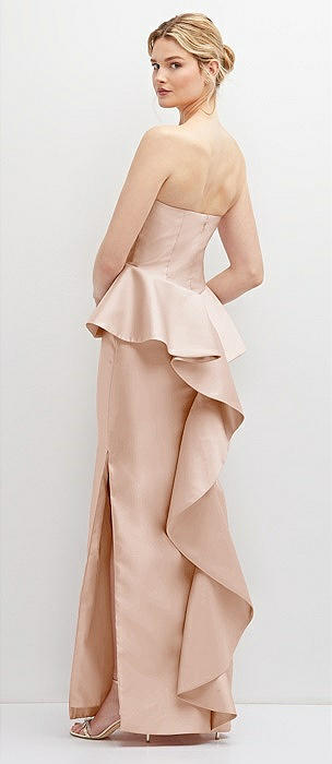 Strapless Satin Maxi Dress with Cascade Ruffle Peplum Detail in cameo