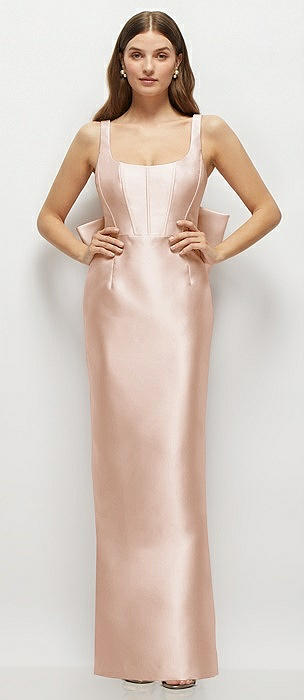 Scoop Neck Corset Satin Maxi Dress with Floor-Length Bow Tails in cameo
