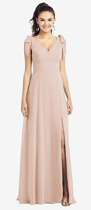 Bow-Shoulder V-Back Chiffon Gown with Front Slit in cameo