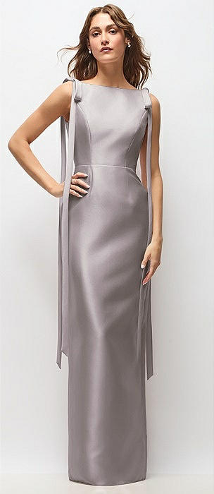 Bateau Neck Satin Column Maxi Dress with Exaggerated Tail Bow Straps in cashmere gray