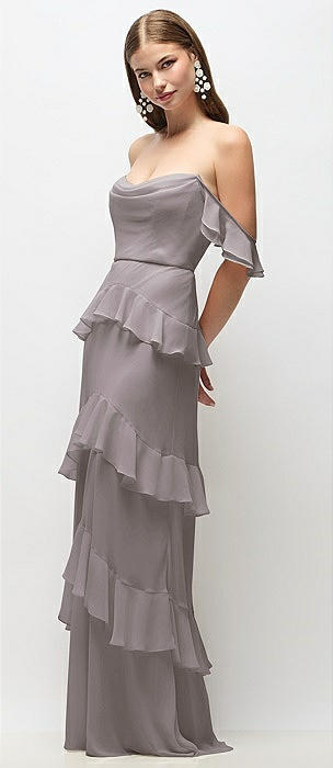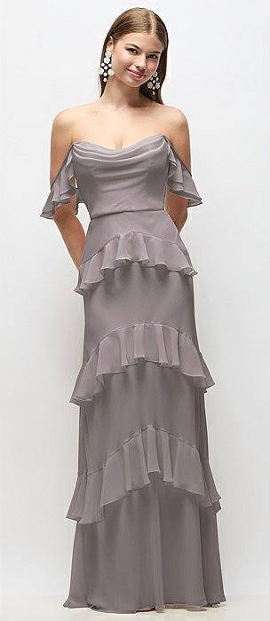 Off-the-Shoulder Cowl Chiffon Tiered Ruffle Maxi Dress with Convertible Ruffle Straps in cashmere gray