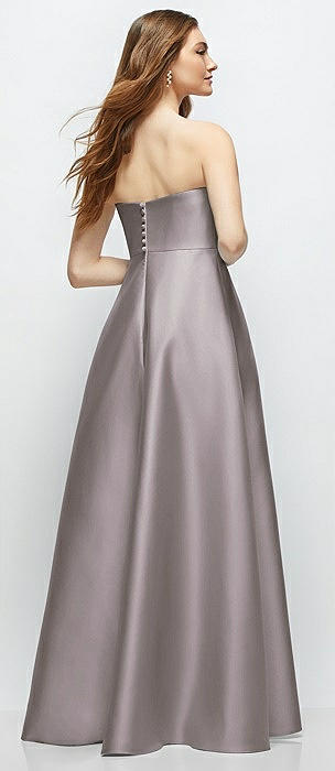 Strapless Satin Gown with Full Skirt and Covered Buttons at Back in cashmere gray