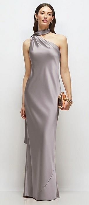 Draped Scarf One-Shoulder Bias Stretch Satin Maxi Dress in cashmere gray