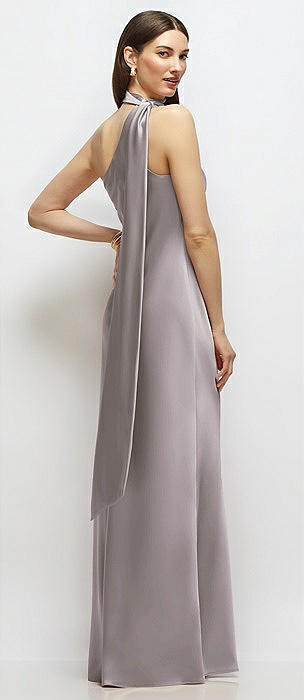 High-Neck Halter Open-Back Satin Trumpet Dress in cashmere gray