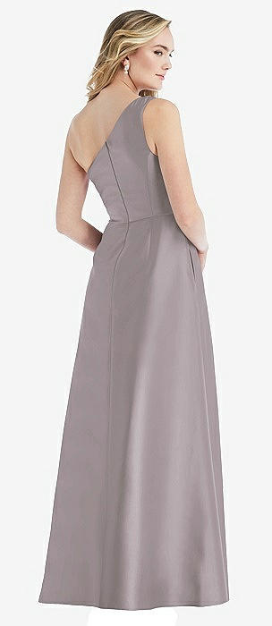 One-Shoulder Satin Gown with Draped Front Slit and Pockets in cashmere gray