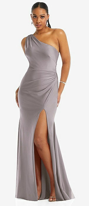 One-Shoulder Asymmetrical Cowl Back Stretch Satin Mermaid Dress in cashmere gray