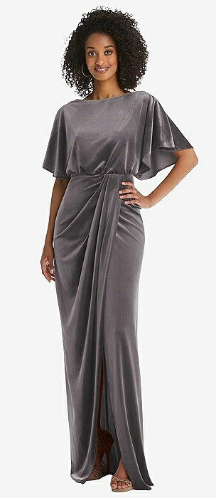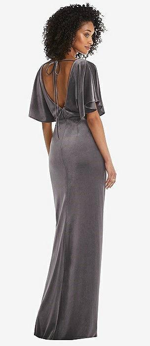 Flutter Sleeve Open-Back Velvet Maxi Dress with Draped Wrap Skirt
