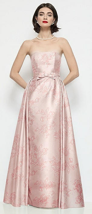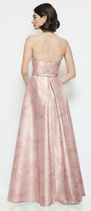 Strapless Cat-Eye Boned Bodice Gold Leaf Brocade Maxi Dress with Ruffle Hem in winter rose