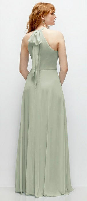 Shirred Halter Chiffon Maxi Dress with Back Sash-Tie Closure in celadon