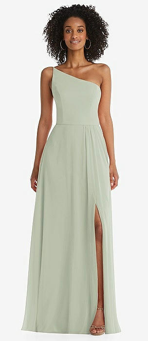 One-Shoulder Chiffon Maxi Dress with Shirred Front Slit in celadon
