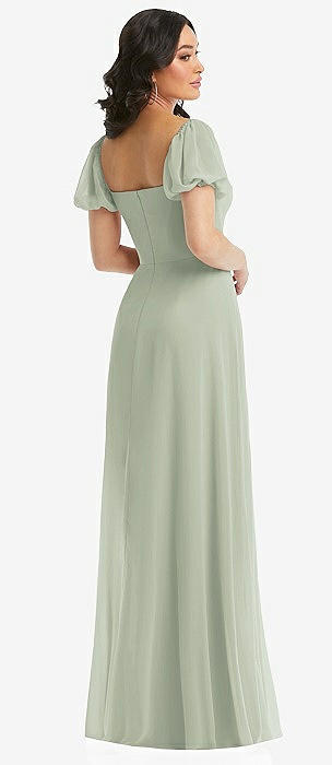 Puff Sleeve Chiffon Maxi Dress with Front Slit in celadon