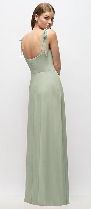 Bow-Shoulder V-Back Chiffon Gown with Front Slit in celadon