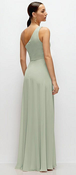 One-Shoulder Chiffon Maxi Dress with Shirred Front Slit in celadon