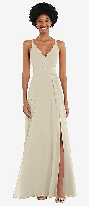 Shirred Shoulder Criss Cross Back Maxi Dress with Front Slit in champagne