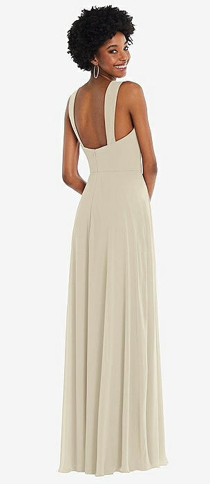 Plunge Halter Open-Back Maxi Bias Dress with Low Tie Back in champagne
