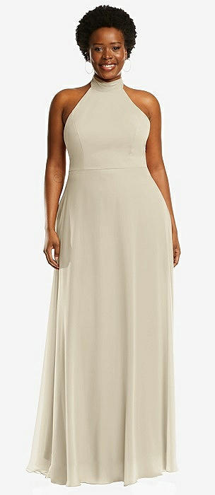 High-Neck Halter Open-Back Satin Trumpet Dress in champagne